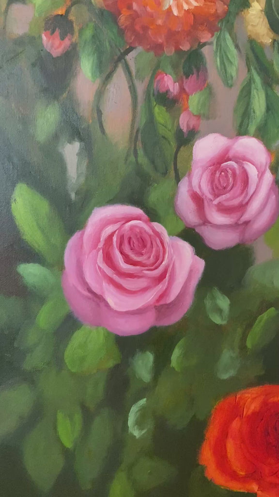 The images of Robbie's floral oil paintings that we've included below include both alla prima and layered oil painting techniques, sometimes within the same artwork. It can be tricky to see the difference between these methods from photos, but you might like to compare the roses (which were painted alla prima) to the sunflowers and orchid (that were painted in layers) to see if you can pick the differences. The full paintings shown are many weeks and months in the making, and so are obviously beyond the scope of this workshop; however, the last image shows works-in-progress of the subject that you will tackle in this workshop which will provide you with the essential skills you need to embark on larger projects.
